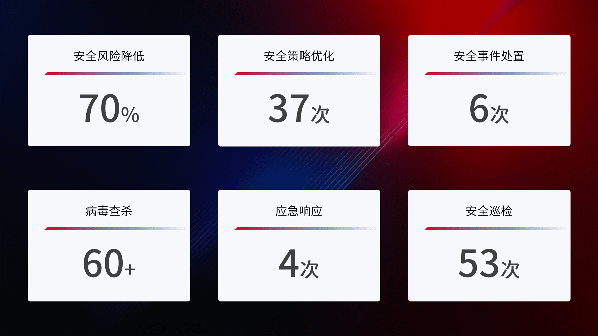 提供全面的安全事件报告体系,,,,包括处置报告、、、、周报、、季度和年度总结,,结合持续监控,,,,帮助客户深入了解网络安全状况。。。